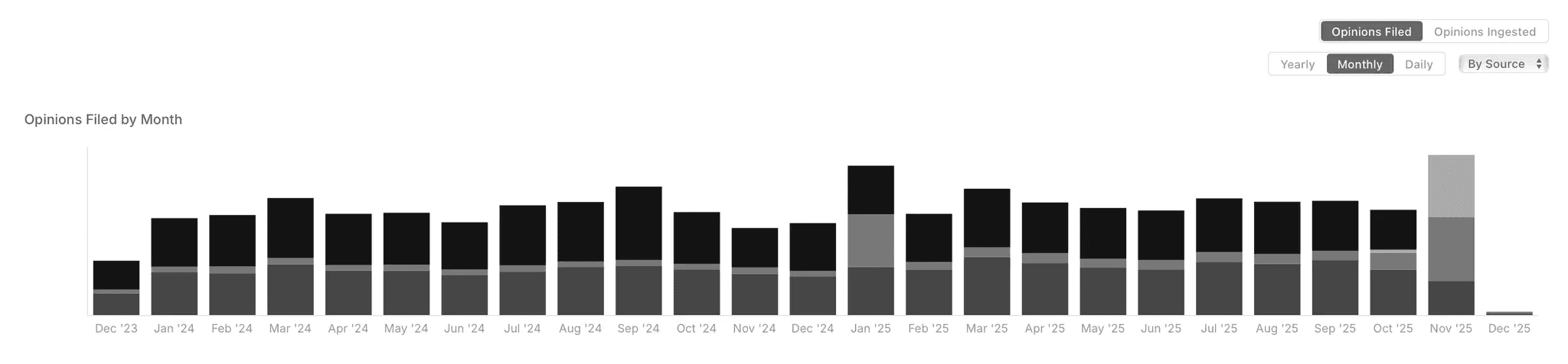 Direct PostgreSQL access. Run any SQL query against our full corpus. Direct PostgreSQL access for real-time sync, full opinion text, and schema docs. Real-time sync, <10 seconds lag. Full opinion text, citator, and relational case graph. Schema docs with dedicated support.